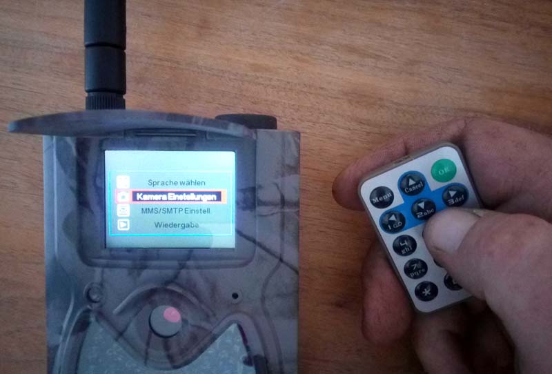 Die Bedienung erfolgt über die mitgelieferte Fernbedienung. Die Taste "Menu" drücken und das Hauptmenü der Kamera öffnet sich auf dem Display der Wildkamera. Die Navigation erfolgt mit den Pfeiltasten auf der Fernbedienung, bestätigen mit der grünen OK-Taste.