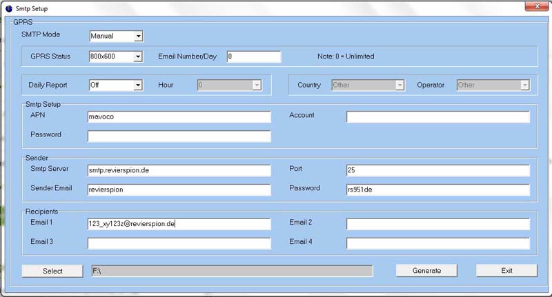 Klicken Sie auf den Button "Smtp Setup" und ein neues Fenster öffnet sich, wo Sie die GPRS Einstellungen vornehmen müssen. Wir gehen diese hier schrittweise mit Ihnen durch. "SMTP Mode" auf "Manual" stellen. Unter "GPRS Status" können Sie die Bildgröße und Anzahl der Fotos pro Tag einstellen.
