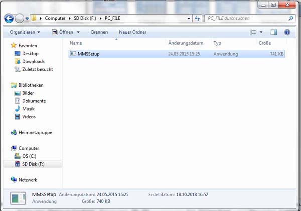 Dazu die SD-Karte mit einem Computer öffnen und die Datei "PC_FILE.zip" entpacken. Jetzt die Datei "MMSSetup.exe" mit dem Computer öffnen.