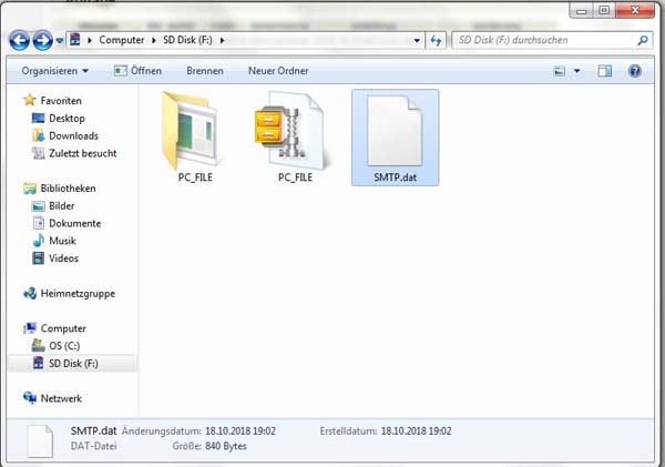 Wenn alles funktioniert hat, sollte sich jetzt die Datei "SMTP.dat" auf der SD-Karte befinden.