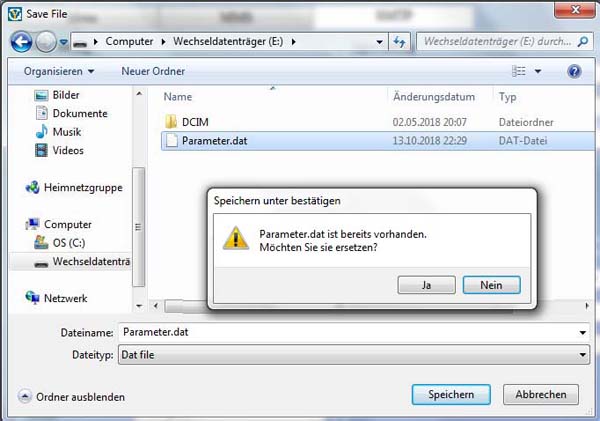 Zum Schluss muss die Konfiguration noch gespeichert werden. Dazu klicken Sie unten links auf "Save" und wählen die verbundene Wildkamera als Wechseldatenträger auf Ihrem PC aus. Die Datei bitte als "Parameter.dat" im Hauptordner speichern und die bereits vorhandene Datei ersetzen.