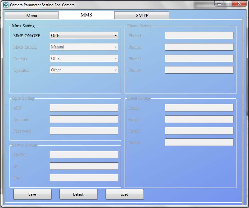 MMSConfig öffnen und unten auf den Knopf "Load" drücken. Jetzt unsere voreingestellte Konfigurationsdatei, welche Sie auf Ihren PC runtergeladen haben, auswählen. Die wichtigsten Dinge sind jetzt bereits eingestellt, wir gehen die Konfiguration trotzdem einmal durch.
