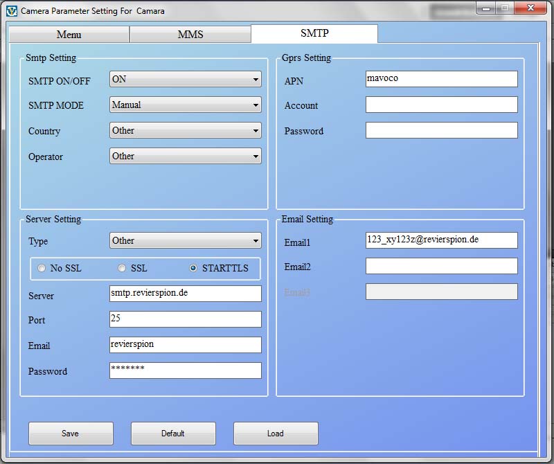 Dieses Modul wird zur Übertragung der Fotos an die RevierSpion App benötigt und muss daher auf ON gestellt sein. "SMTP MODE" bitte auf "Manuel" stellen.