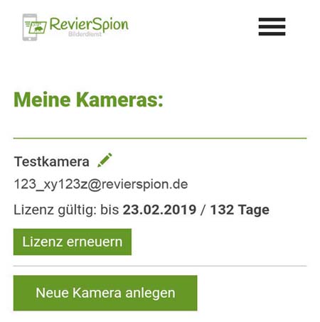 Bei "Email Setting" muss man jetzt eine Verbindung zur RevierSpion App herstellen. Falls noch nicht erfolgt, bitte beim RevierSpion Bilderdienst (Online oder in der App "RevierSpion") registrieren. Unter "Mein Konto" finden Sie den Punkt "Meine Kameras". Dort bitte eine neue Kamera anlegen. Die Bezeichnung kann frei gewählt werden wie "Kirrung" oder "Suhle" und auf Speichern klicken. Jetzt wird die Kamera unter "Meine Kameras" aufgelistet und hat eine eigene eMail-Adresse bekommen, welche Sie in der Spalte "ID / E-Mail Adresse" finden.