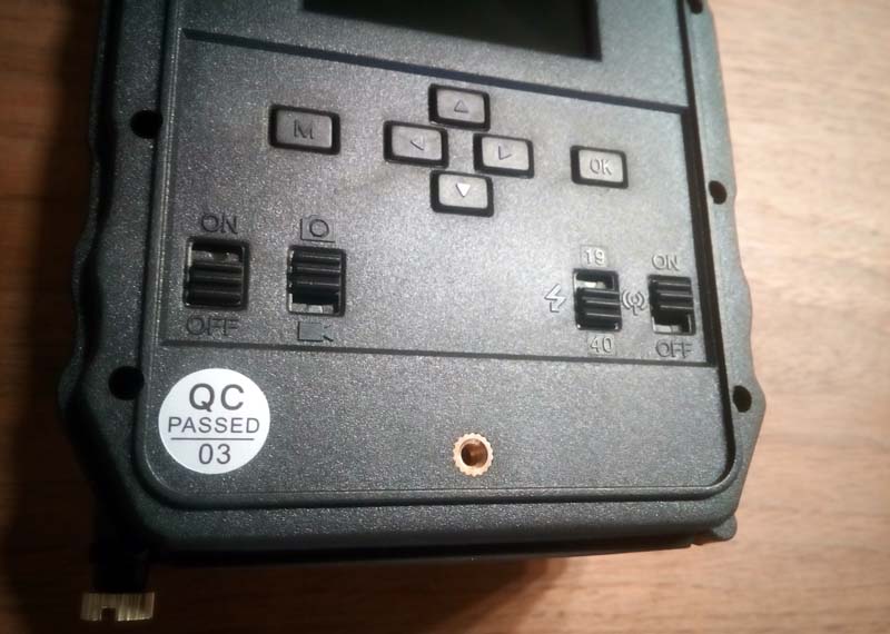 Die Bedienung der Wildkamera erfolgt über die 6 Tasten "M", "OK", "hoch", "runter", "links" und "rechts". Darunter sind noch 4 Schalter, welche richtig eingestellt werden müssen. Damit die Übertragung der Fotos funktioniert, muss der Schalter ganz rechts auf ON gestellt werden.
