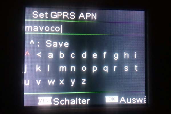 Unter "GPRS Einstellungen" müssen die Provider-Daten der SIM-Karte eingetragen werden. Bei Verwendung einer Mavoco SIM-Karte unter "APN" den Wert "mavoco" eintragen und "Benutzername" und "Passwort" leer lassen. Bei Verwendung einer anderen SIM-Karte müssen hier andere Werte eingetragen werden. Die Werte findet man in dieser Übersicht.