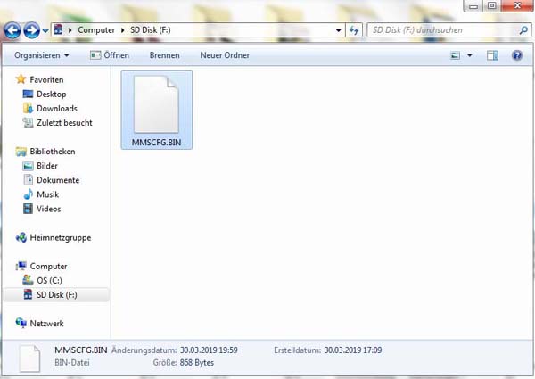 Die vorgenommene Konfiguration muss natürlich noch gespeichert werden. Dazu klicken Sie ganz unten auf "Save as..." und wählen die SD-Karte aus (in diesem Fall das Laufwerk F:\) und speichern die Konfiguration ab.