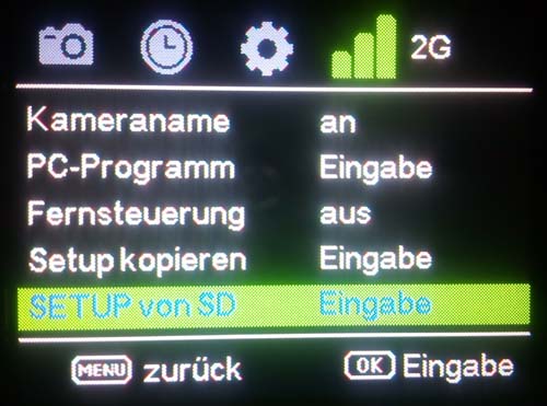 Die Konfiguration muss natürlich noch auf die Wildkamera aufgespielt werden. Dazu stecken Sie die SD-Karte wieder in die Wildkamera und stellen den Betriebsschalter auf "SETUP" und drücken die Taste "Menu". Gehen Sie in das Menü "2G" und wählen "SETUP von SD" aus und bestätigen. Jetzt wird die Konfiguration von der SD-Karte geladen und verarbeitet.