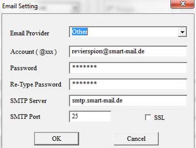 Unter "Send Via" auf "Email Setting ..." klicken und es öffnet sich ein neues Fenster, wo Sie die Daten des SMTP-Servers hinterlegen müssen. Hierfür verwenden wir Smart-Mail, wo wir uns bereits registiert haben.