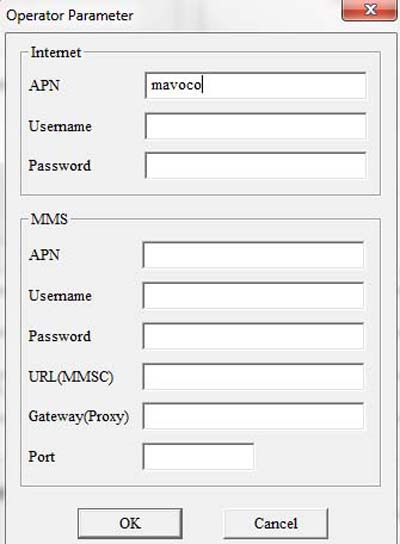 Unter "Operator Parameter" bei "Country" und "Operator" jeweils den Wert "Custom" auswählen und auf den Button "Parameters ..." klicken. Jetzt öffnent sich ein neues Fenster, wo Sie die Einstellungen für die SIM-Karte vornehmen müssen. Hierzu bei "Internet" unter "APN" den Wert "mavoco" eintragen und "Username" und "Password" leer lassen. Bei Verwendung einer anderen SIM-Karte muss hier was anderes eingetragen werden. Die Werte findet man im Internet oder man kann diese beim Provider nachfragen.
