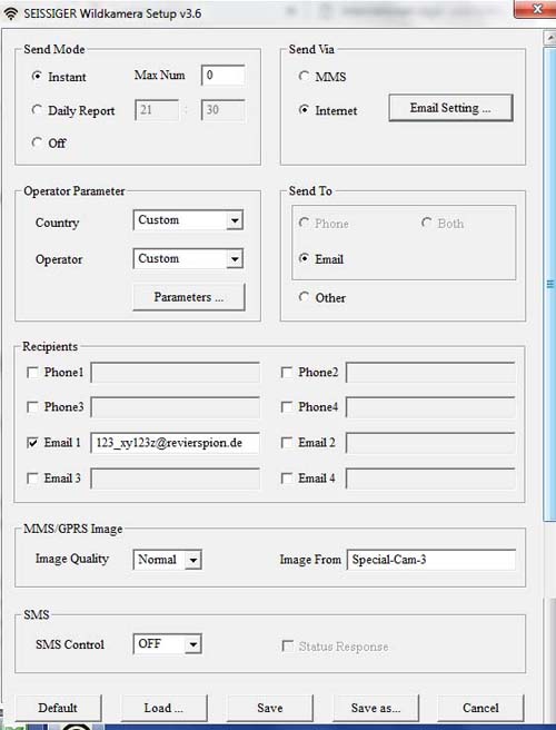 Die GPRS Konfiguration der Wildkamera lässt sich am einfachsten über die Software "SpecialCamSetup" einstellen. Bitte diese Software runterladen und entpacken. Danach die Datei "SpecialCamSetup.exe" öffnen. Wir gehen die GPRS Konfiguration schrittweise durch und erklären Ihnen die Bedeutung und welche Werte Sie wo eintragen müssen. Bei "Send Mode" müssen Sie "Instant" auswählen und über "Max Num" können Sie die Anzahl der Fotos, welche pro Tag übertragen werden, begrenzen. Der Wert 0 ist dabei unbegrenzt. Unter "Send Via" stellen Sie die Übertragungsweise der Fotos ein. Dieser Wert muss auf "Internet" gestellt werden.